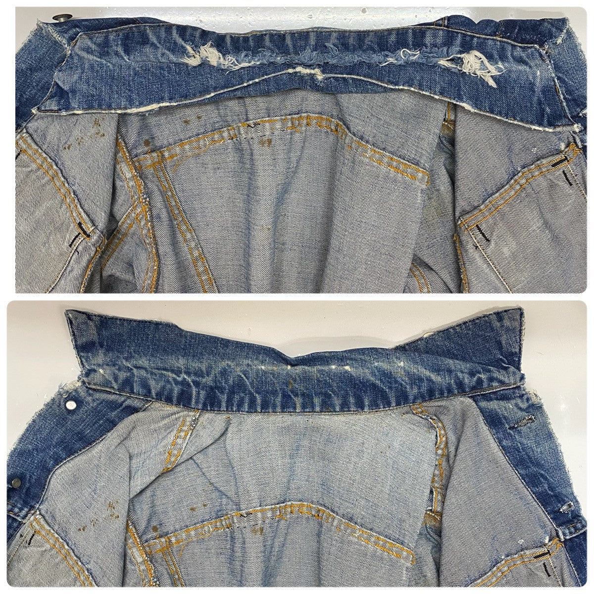 | 状態詳細 | 襟元にダメージ、縫い跡が見られます。袖口や肘周辺、バック上部周辺に傷や汚れが見られます。 その他全体的に使用感、細かい傷や汚れが見られます。詳細は画像をご確認下さい。 |