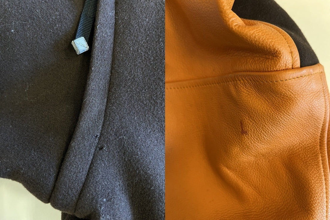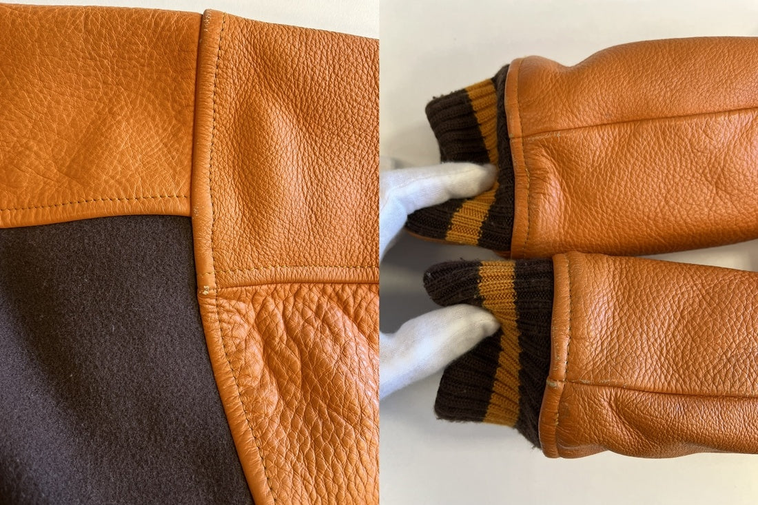 | 状態詳細 | 袖レザー部分汚れ、劣化箇所あり。ジップパーツ加水あり。店頭販売中破損するおそれあり。背面虫食い跡あり。 |