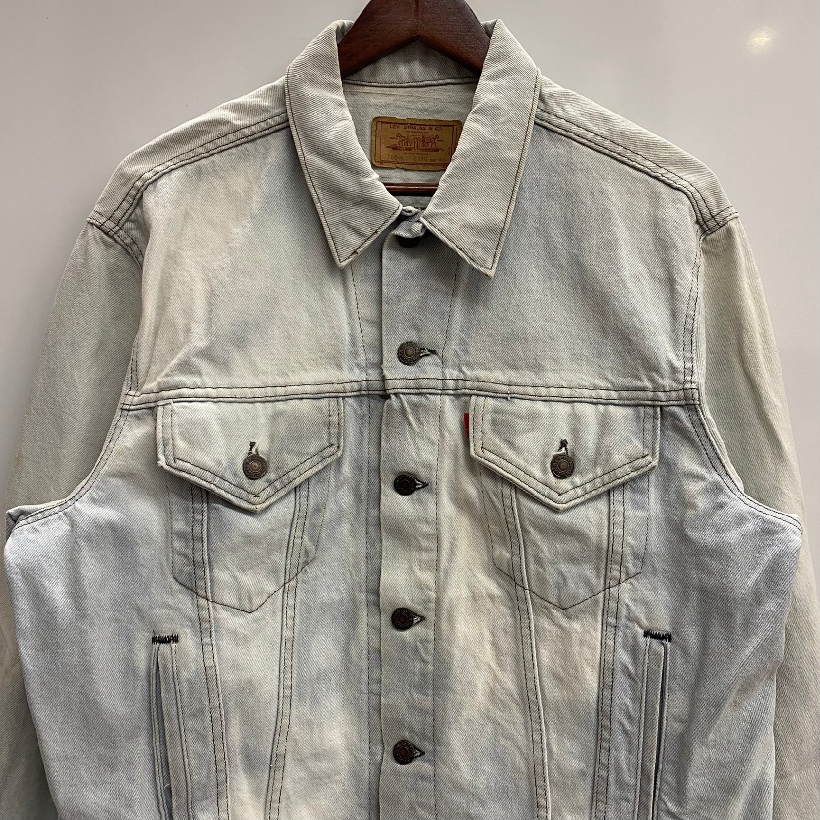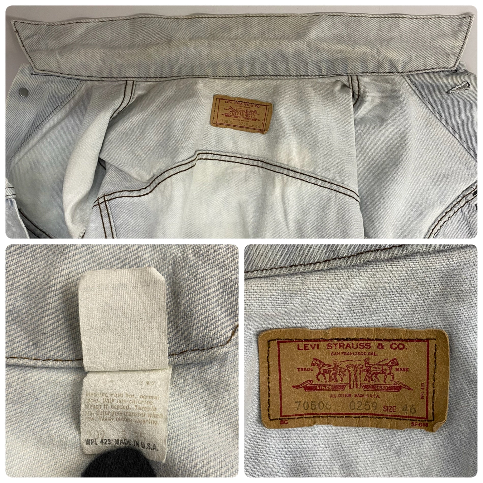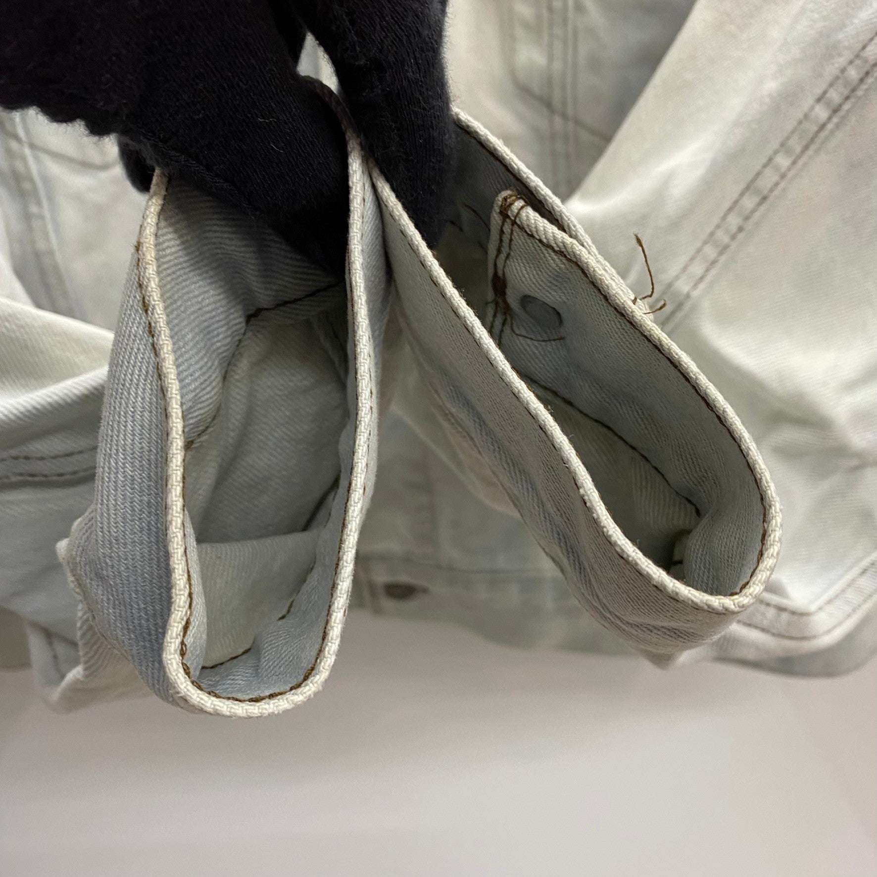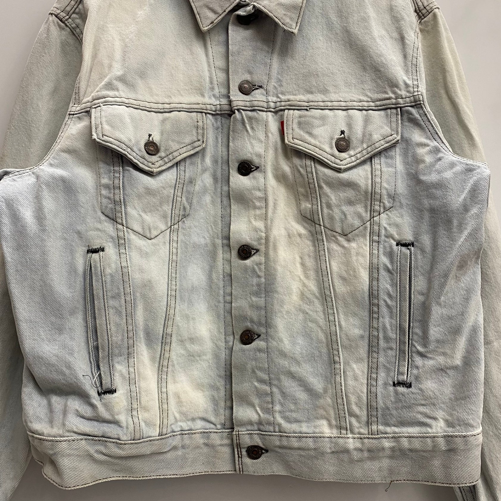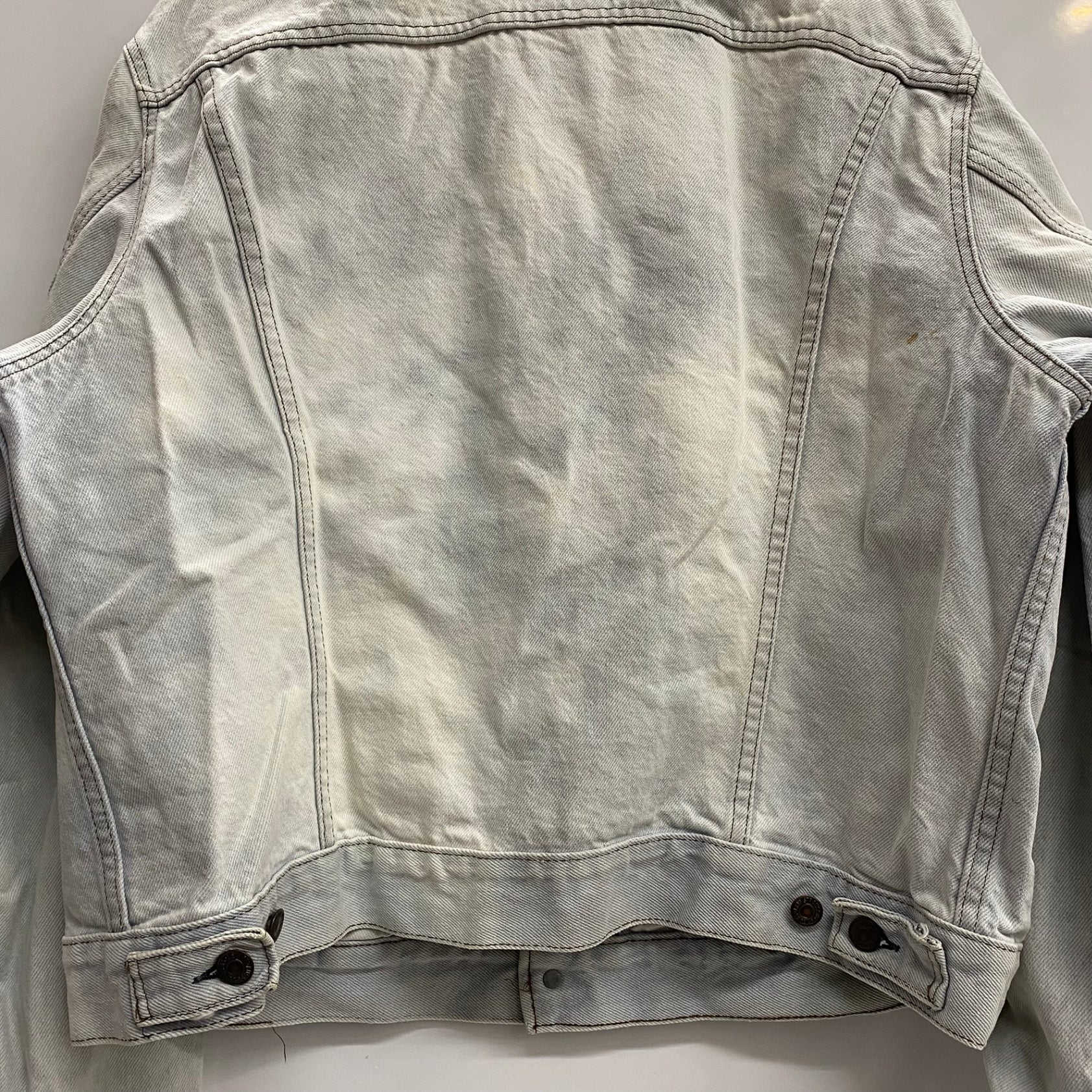 | 状態詳細 | ブリーチされています。青みがかったホワイトのような色合い。右脇周辺にシミ汚れあり。 その他全体的に使用感、細かい傷や汚れがございます。詳細は画像をご確認ください。 |