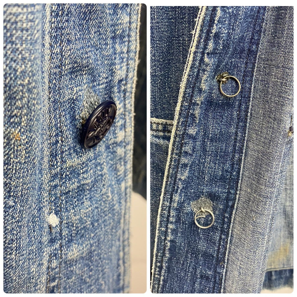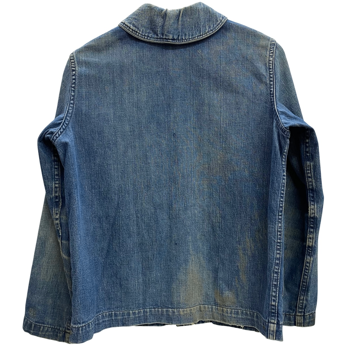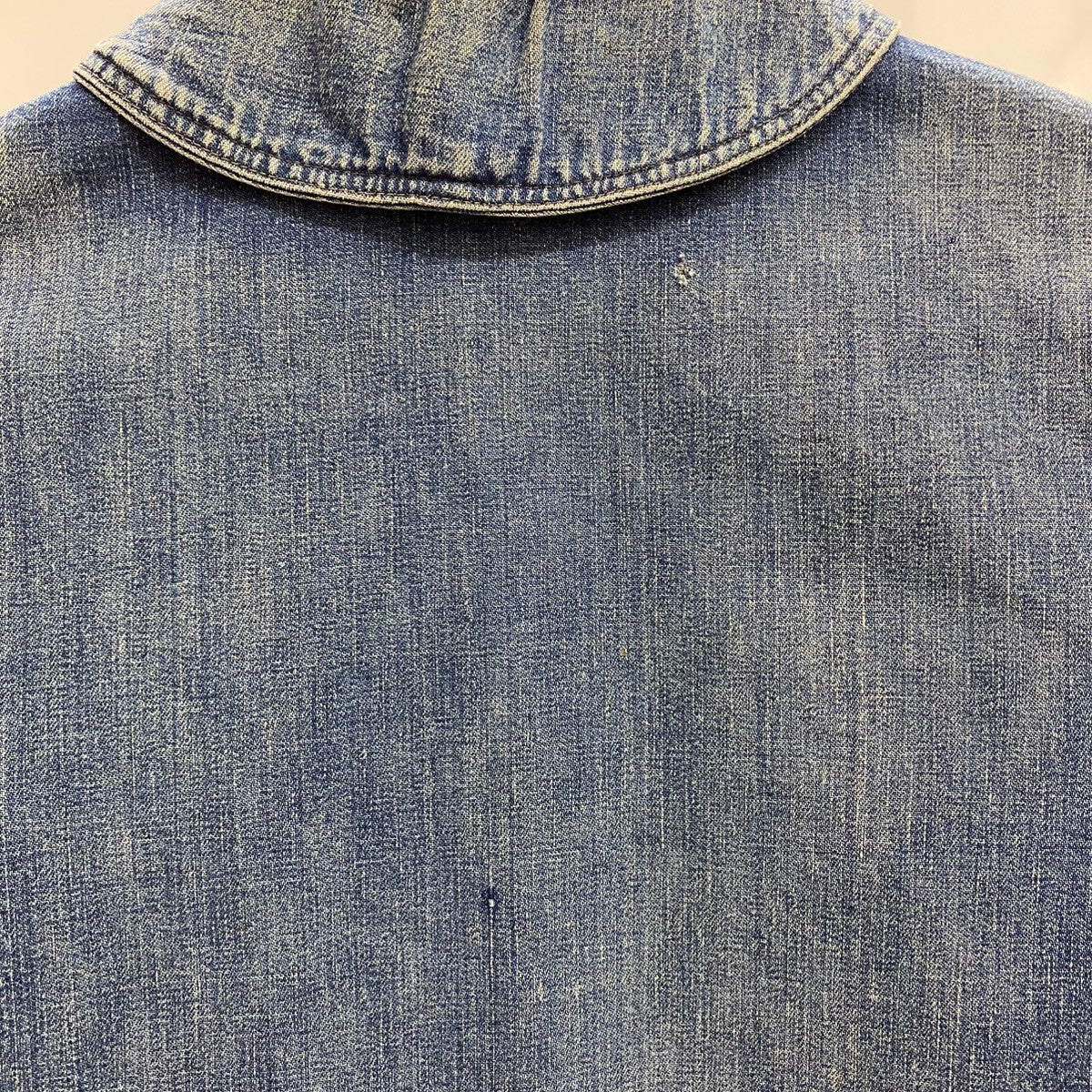 | 状態詳細 | 左袖、一番下ボタン生地にリペア有。左胸、左ポケット、後ろ襟下に少々傷有。後ろ左裾周辺に汚れ、襟元に黄ばみ汚れ、ダメージ有。袖口、裾口にダメージ有。その他全体的に使用感、細かい傷や汚れが見られます。詳細は画像をご確認下さい。 |
