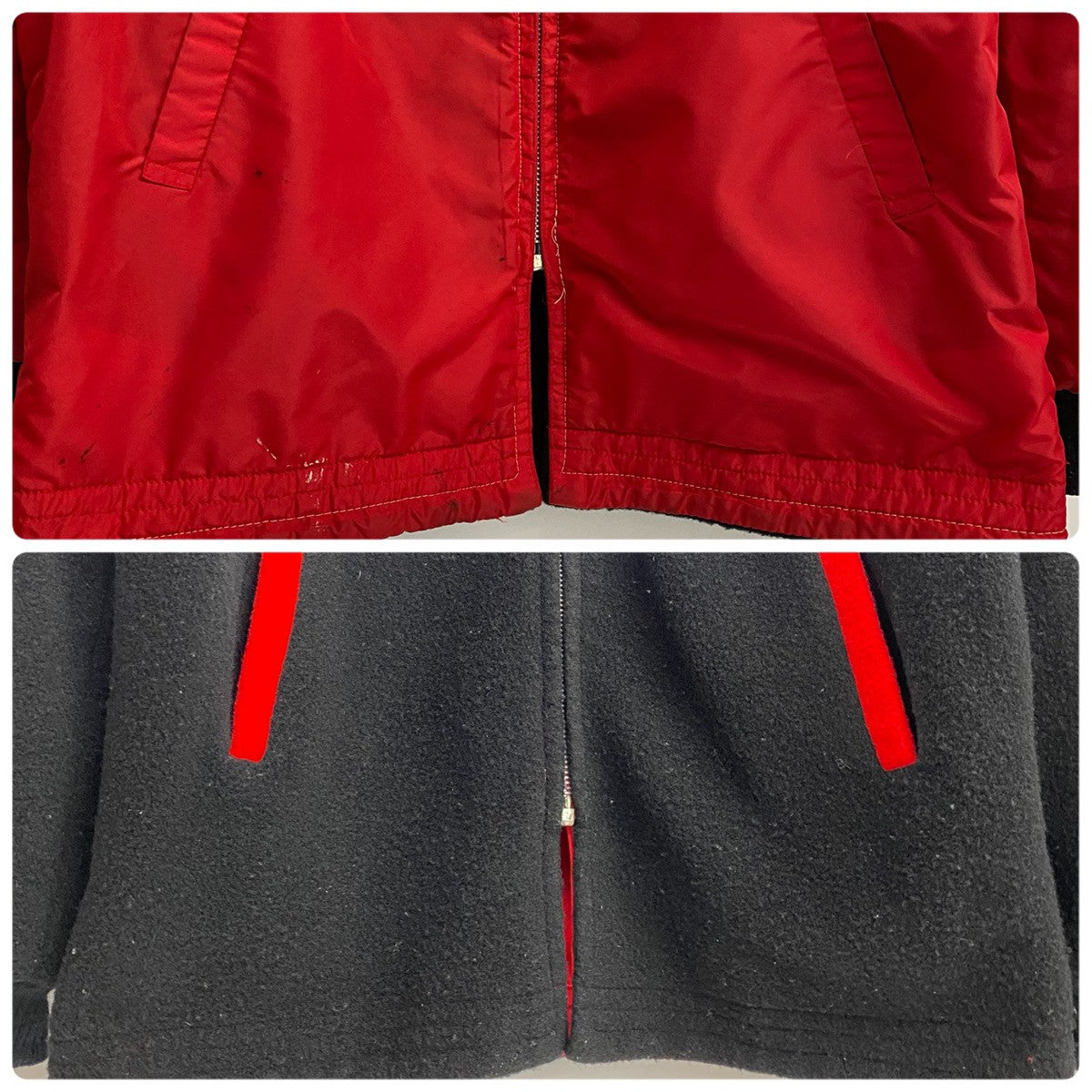 | 状態詳細 | 赤面右ポケット内部破れ有。赤面ポケット周辺、胸周辺、左袖口に汚れ有。黒面全体的に毛玉有。フードジップ破損。 その他全体的に使用感、細かい傷や汚れが見られます。詳細は画像をご確認ください。 |
