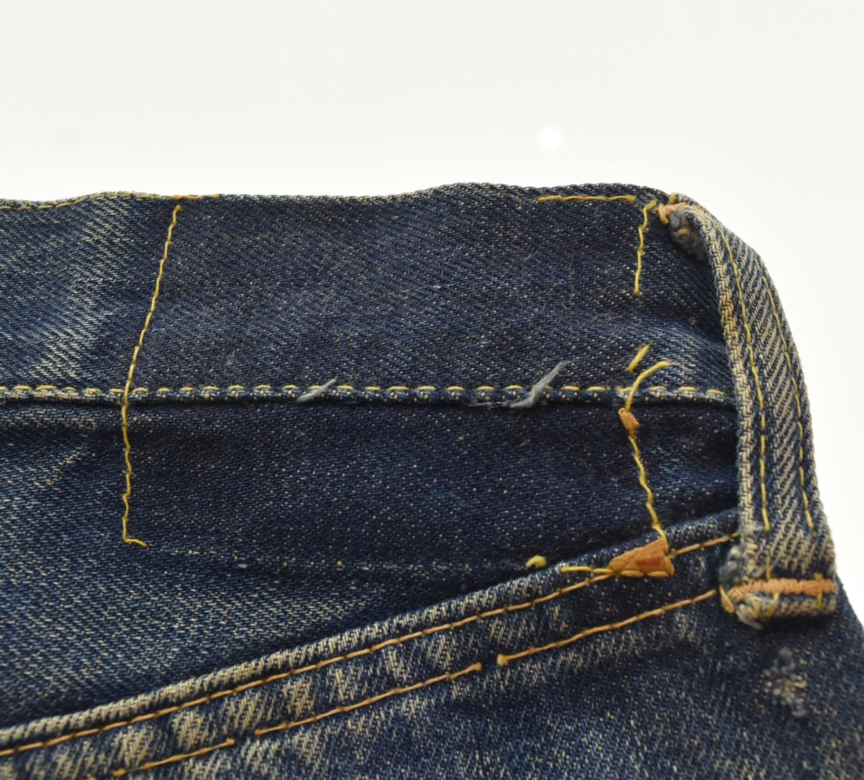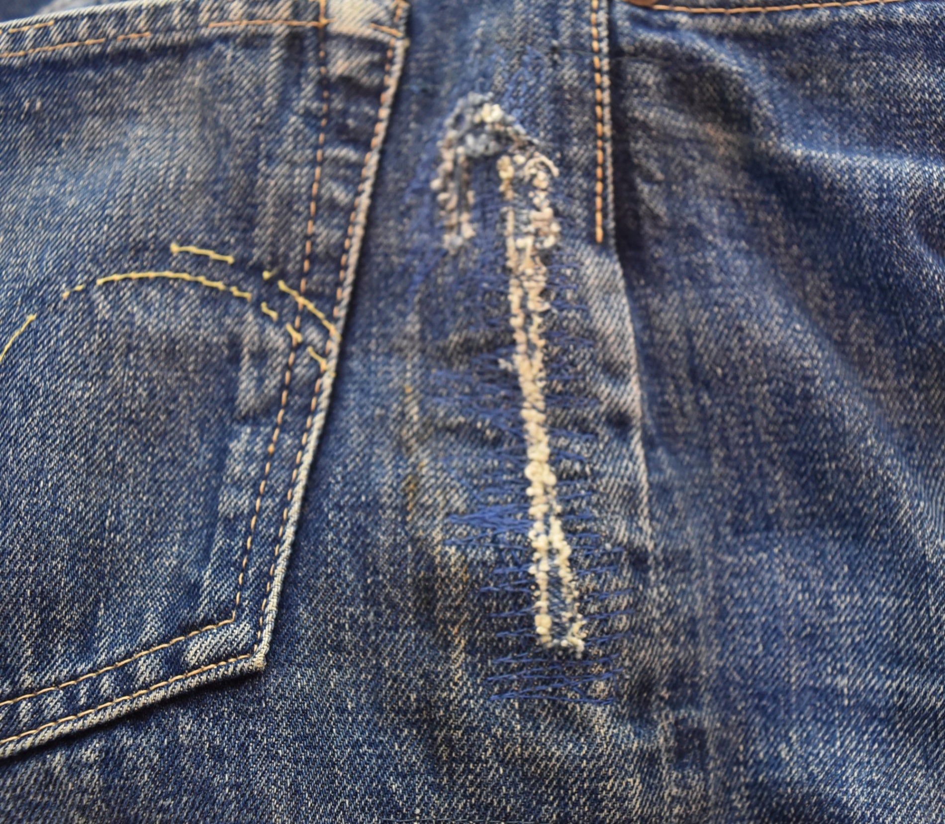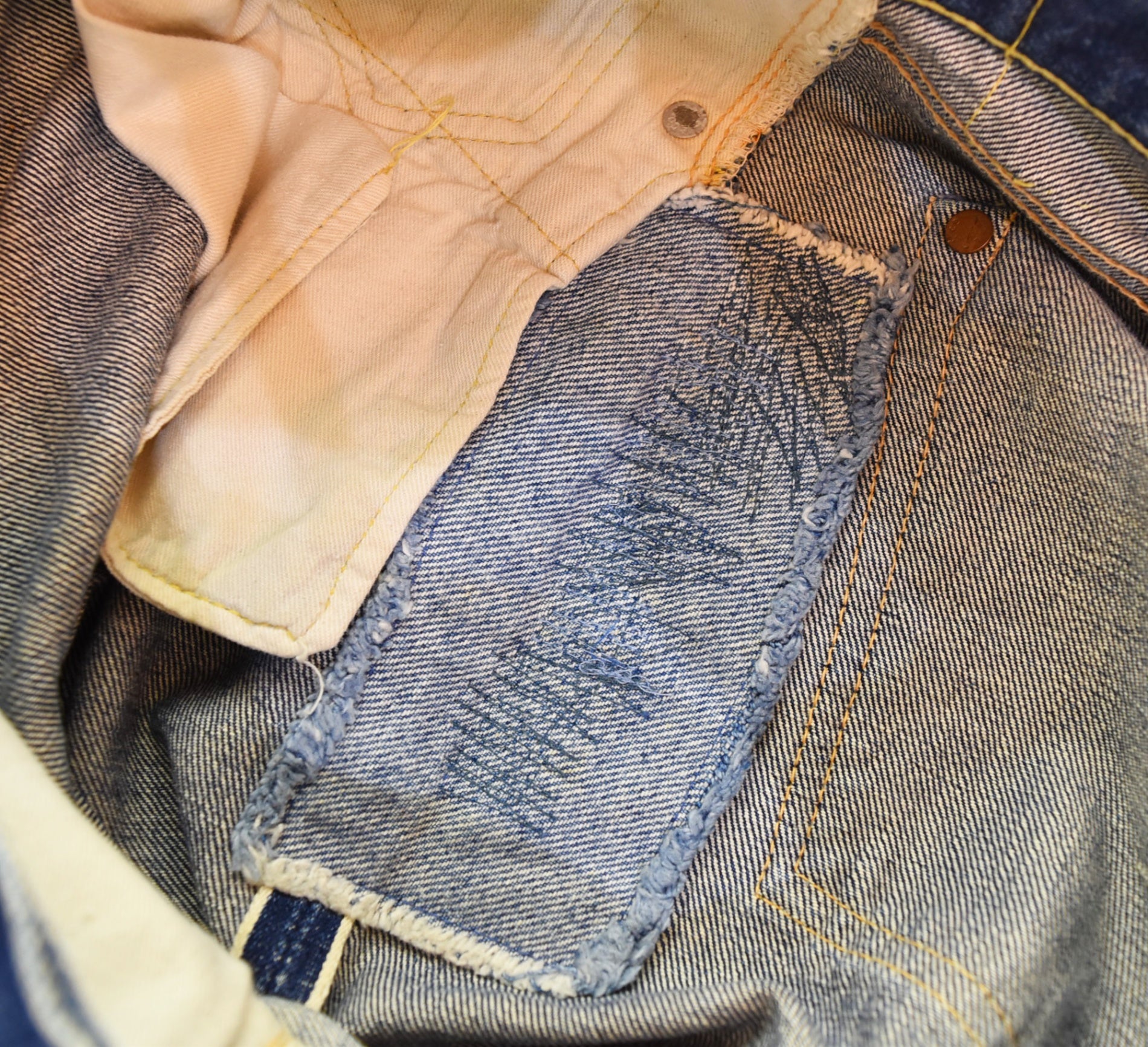 | 状態詳細 | 右足側サイド、裾、股リペアあり 紙パッチ欠損 裾等各所ダメージあり |