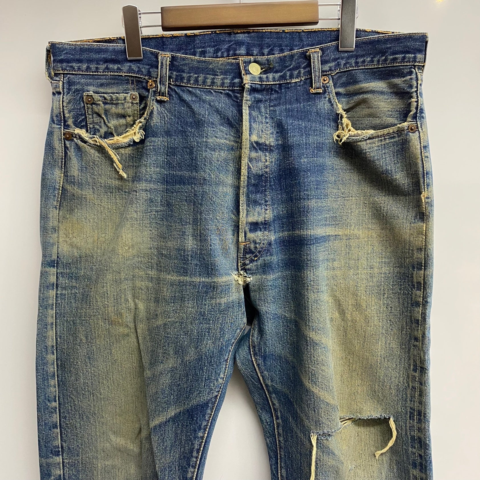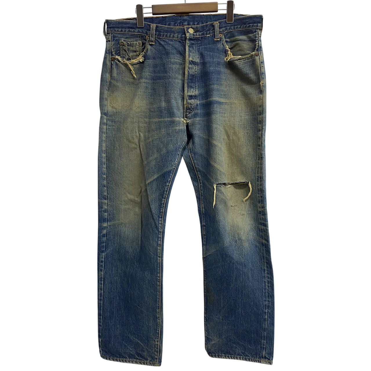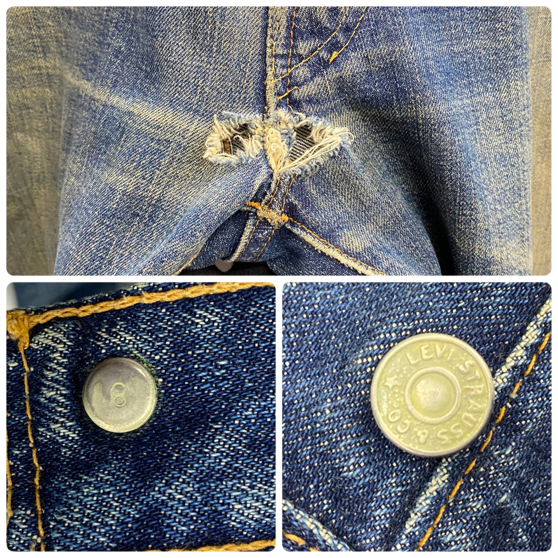 状態詳細 左ひざ、股下、ポケットに破れあり。左ヒップに細かい傷あり。赤タブ欠損。 その他全体的に使用感、細かい傷や汚れがございます。