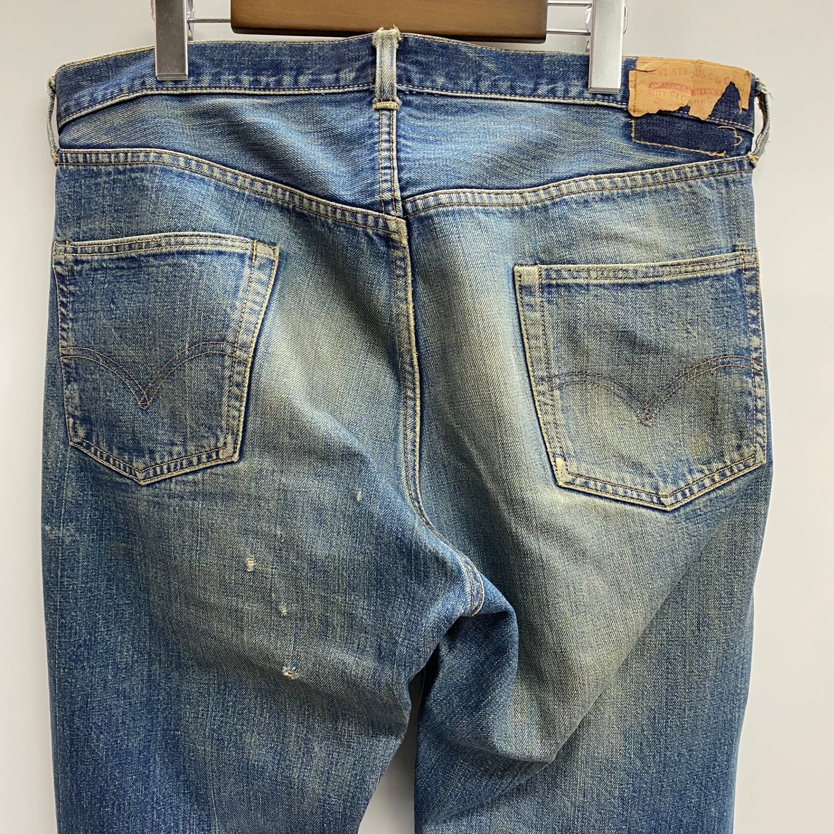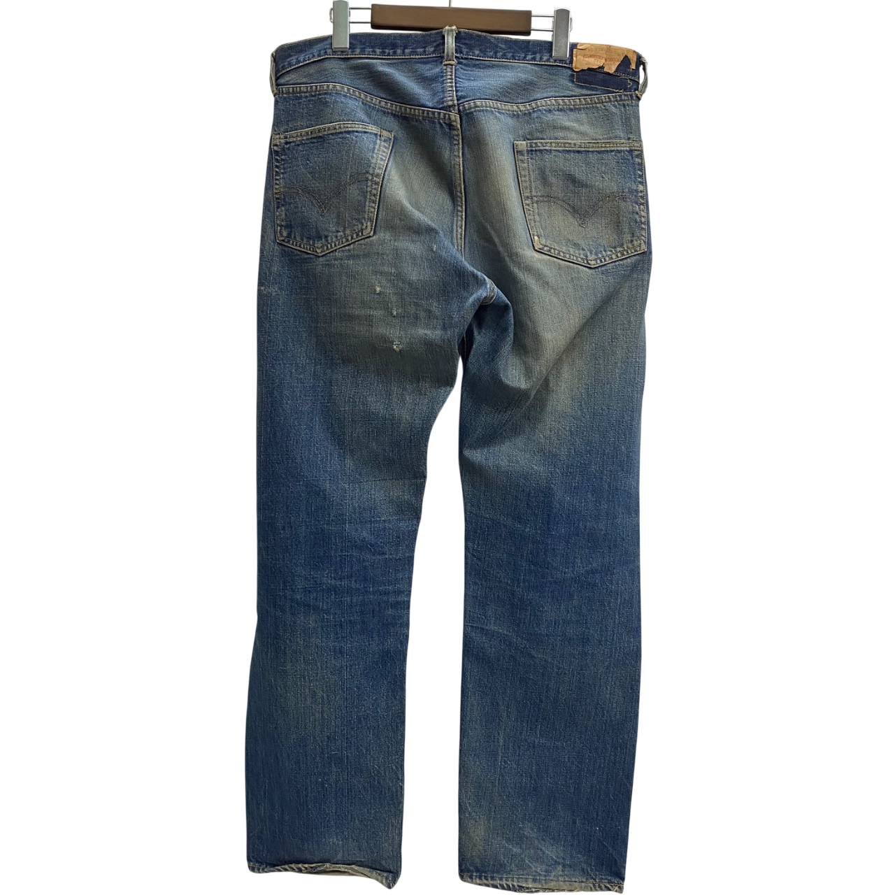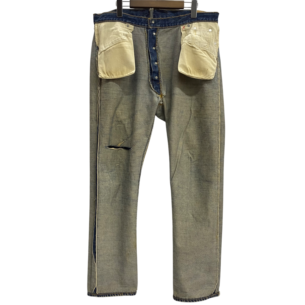 状態詳細 左ひざ、股下、ポケットに破れあり。左ヒップに細かい傷あり。赤タブ欠損。 その他全体的に使用感、細かい傷や汚れがございます。