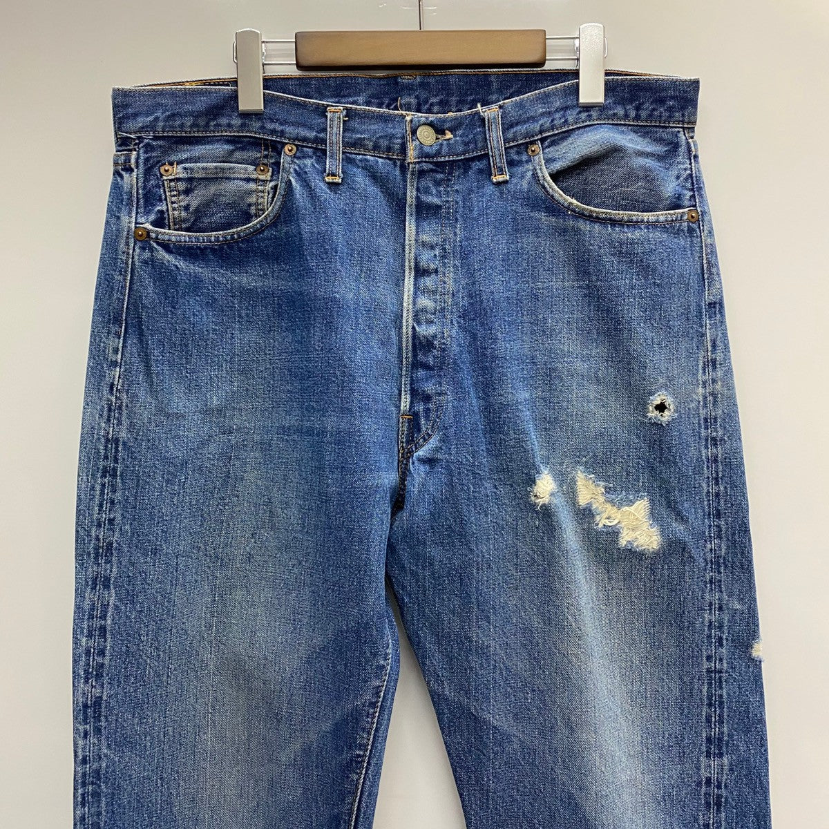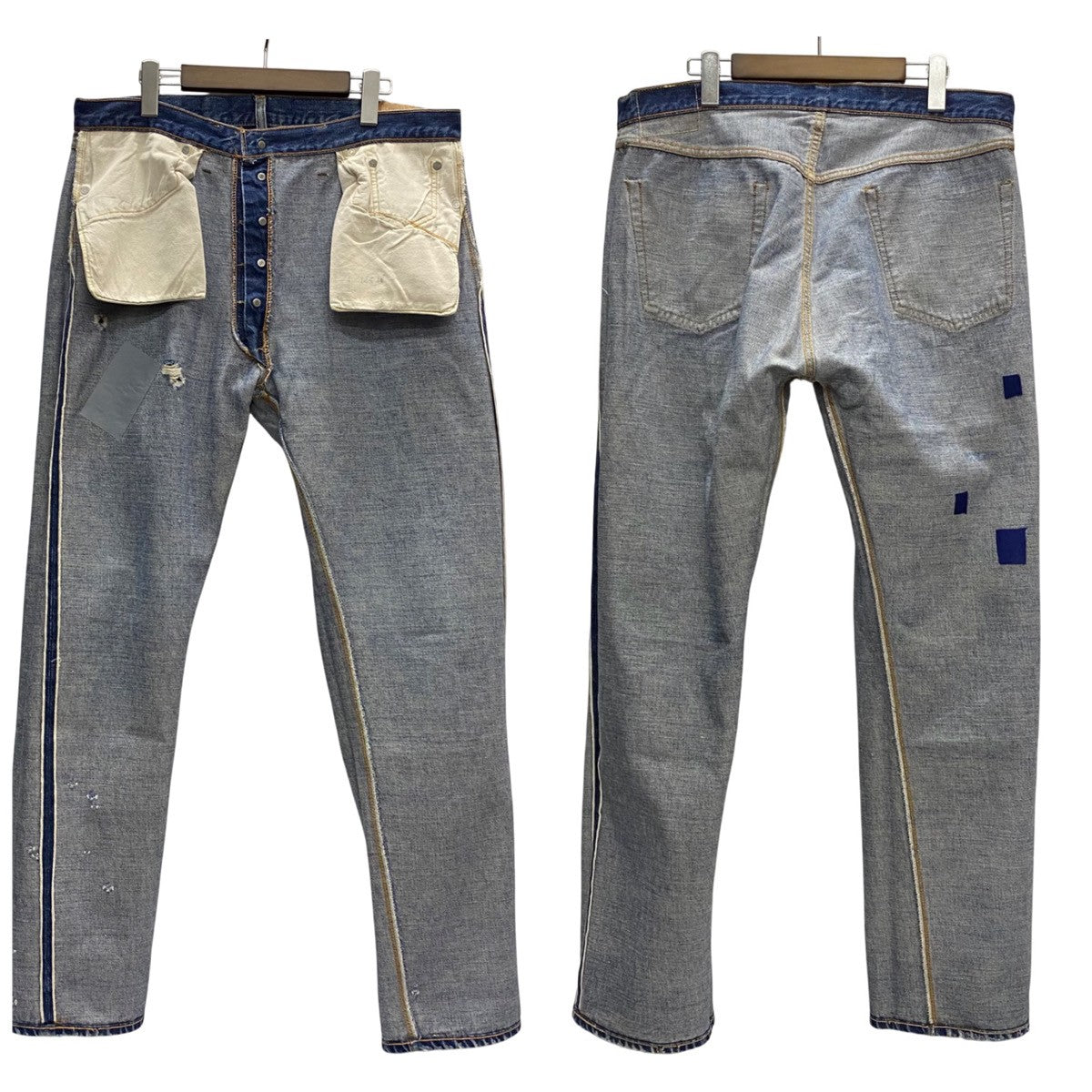 | 状態詳細 | フロント面左ポケット下にリペア跡、穴有。右裾一か所、左裾に数か所細かい傷有。左後ろポケット周辺に白い汚れ、ダメージ有。 その他全体的に使用感、細かい傷や汚れが見られます。詳細は画像をご確認ください。 |