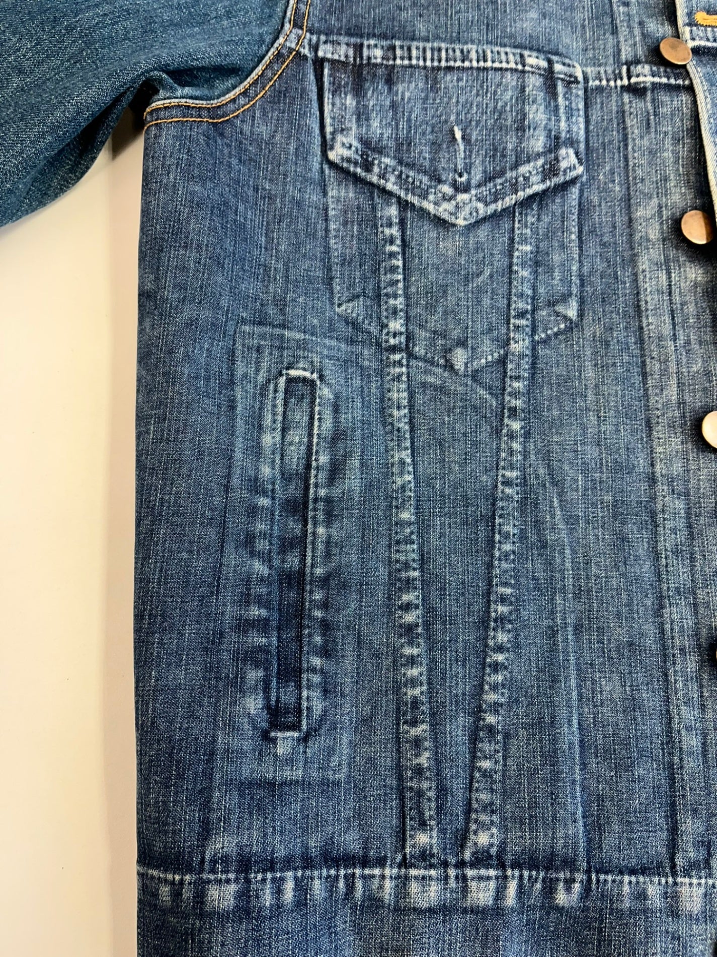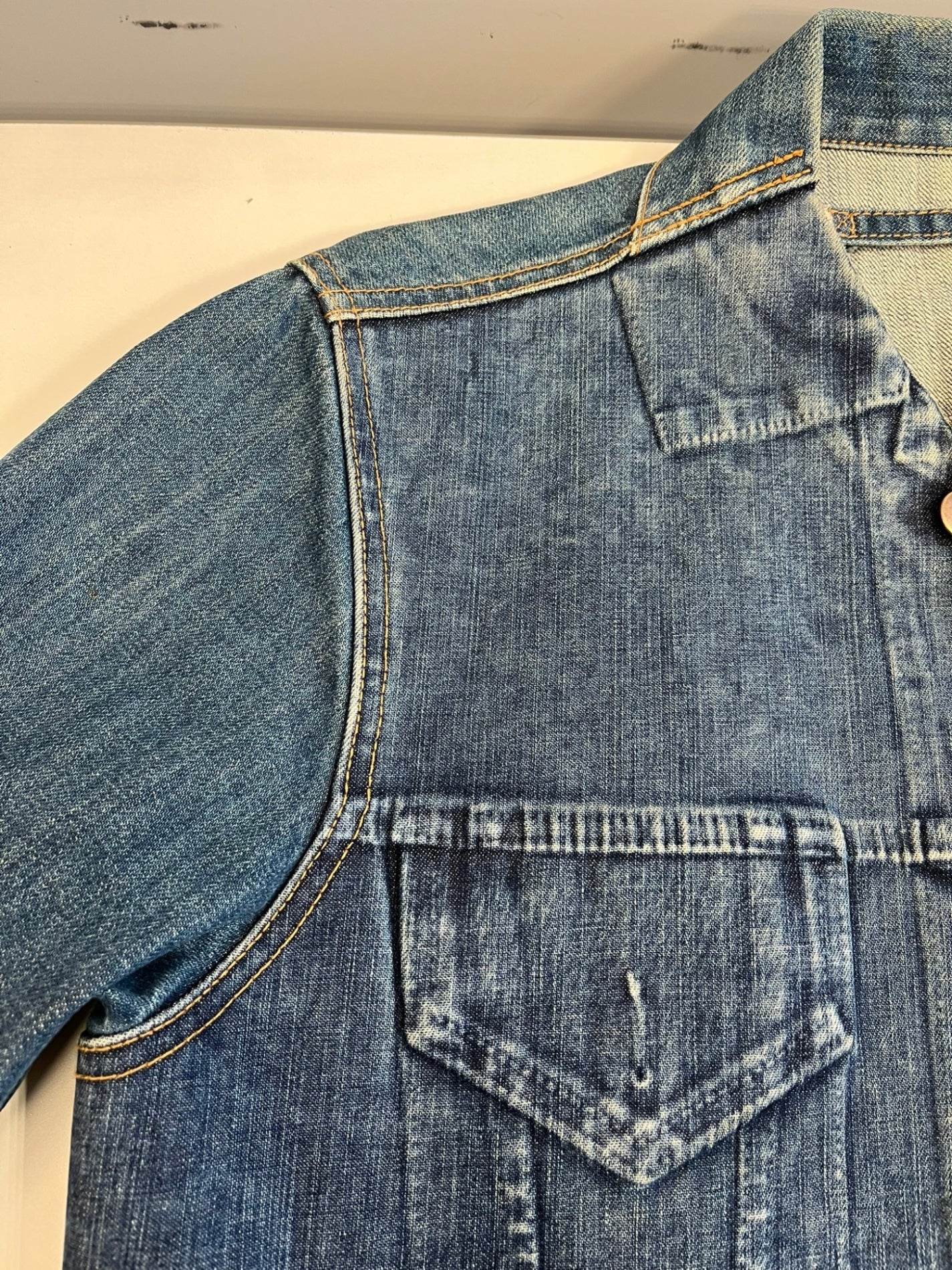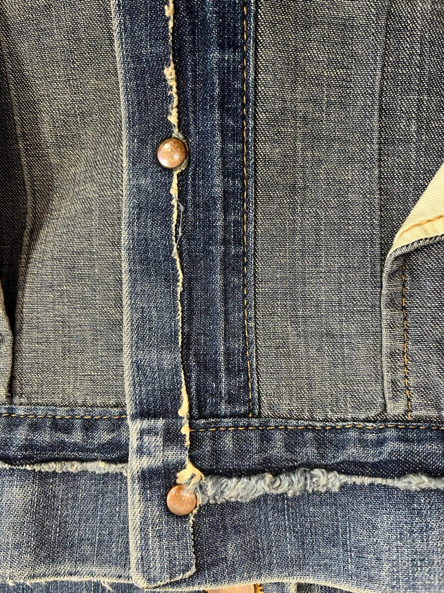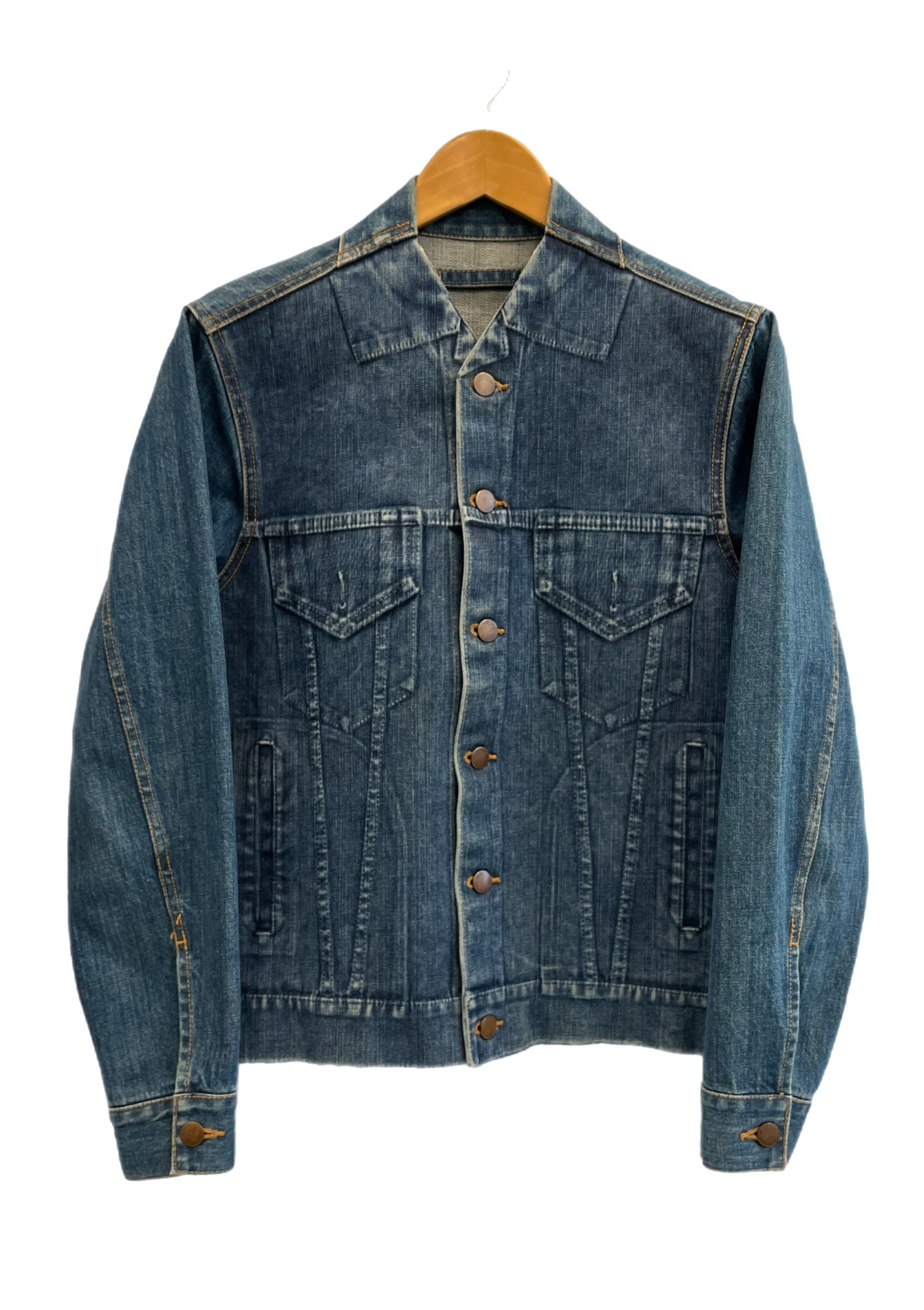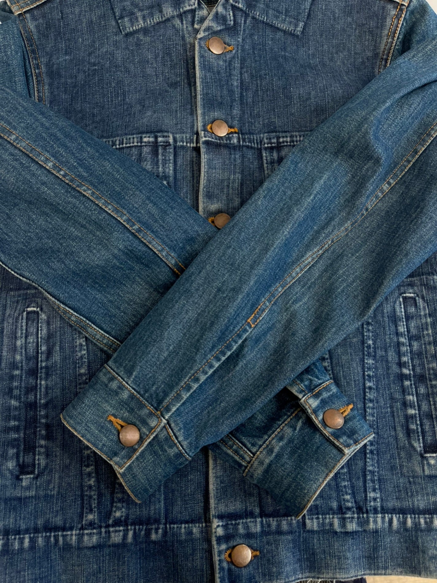状態詳細 デニム特有の着用感あり。※ジャケット前身頃部分に別生地が付けてあるデザインとなります。ポケットなどはご利用いただけませんのであらかじめご了承ください。